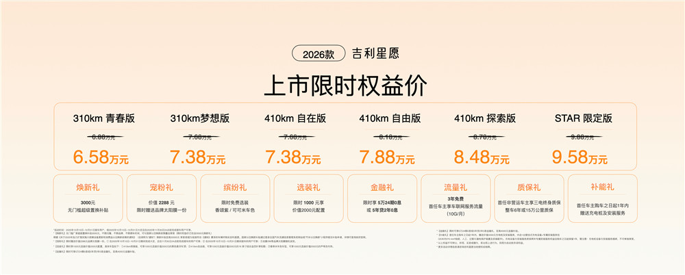 2026款吉利星愿上市限时权益价为6.58万元–9.58万元。同时为回馈用户支持,同步推出八重限时购车权益,包括焕新礼、宠粉礼、缤纷礼、选装礼、金融礼、流量礼、质保礼、补能礼,进一步降低拥车门槛,提升用车体验。