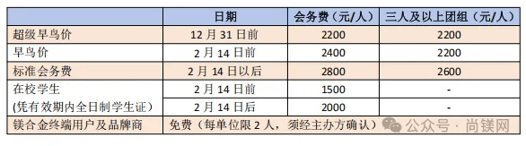 镁合金终端用户单位可免费参会(每公司仅限免2人,需经主办方提前确认,额满为止。镁及合金终端用户单位指:汽车、自行车、摩托车整车厂/品牌商;手机、电脑、通讯器材、工具、休闲用品、人形机器人、飞机及航空器等终端产品品牌商,不含零部件厂商。)