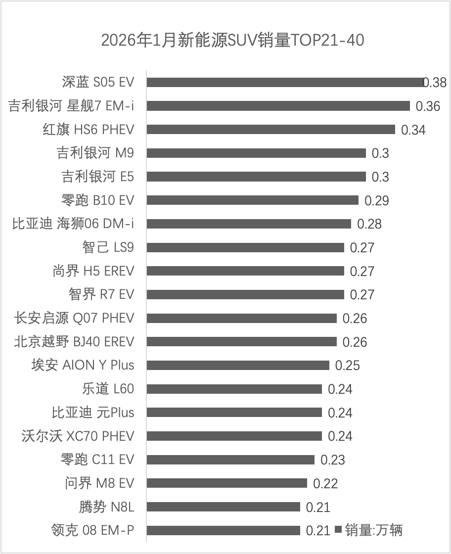 其余10-15万元SUV的产品基本上都是三四千辆的水平,包括宋L DM-i、零跑C10、比亚迪海狮06 EV、启源Q05 EV、深蓝S05 EV、埃安i60 EV、星舰7 EM-i、银河E5等等。而之前销量很好的银河M9在1月销量仅为3000辆左右,奇瑞风云T11则没有进入TOP40。