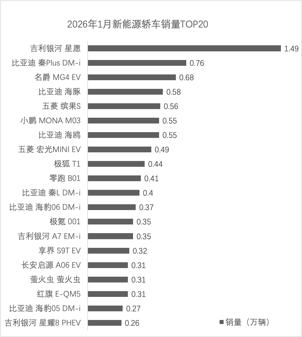 1月新能源轿车销量变化非常大,尽管吉利银河星愿继续拿下轿车销量冠军,但也明显受到了政策影响。具体来看,银河星愿售出1.49万辆,占吉利银河总销量42%。