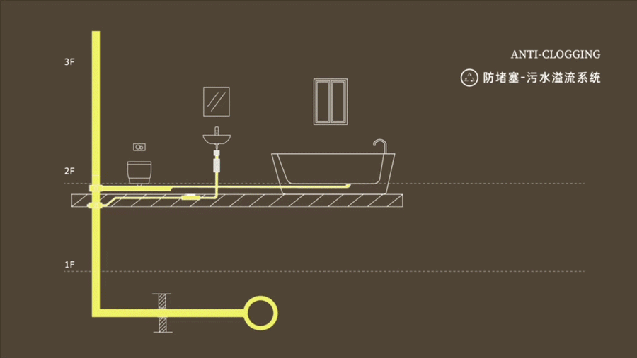 针对住宅二楼户内排污管道常因主下水管底部杂物积聚,易引发堵塞及返水问题,在主立管地下室部分增设溢流管。当管道发生堵塞时,污水可经由溢流口及时排出。