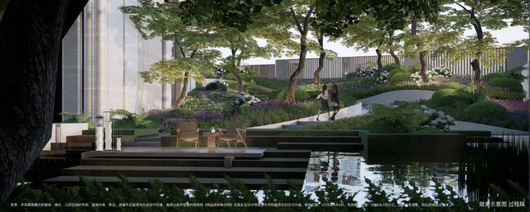 不仅如此,整体抬高也提升了小区私密性,站在外部,视线因地势落差被有效阻隔,极难窥探到园林内部的场景。这一设计完美化解了地块本身的难题: