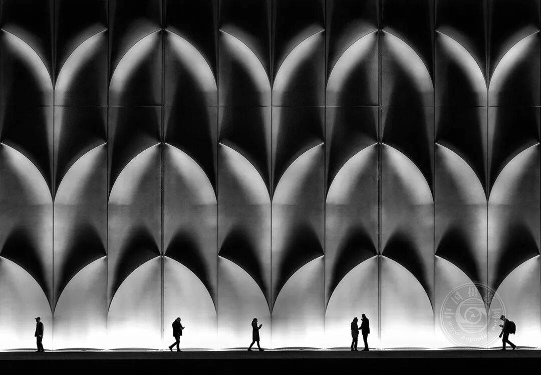 这张黑白照片生动捕捉了人物剪影与几何光影背景间的强烈对比。建筑的对称性营造出韵律感,而人物则赋予画面动态与尺度。光影的交织强化了戏剧性氛围,营造出近乎电影般的视觉效果。