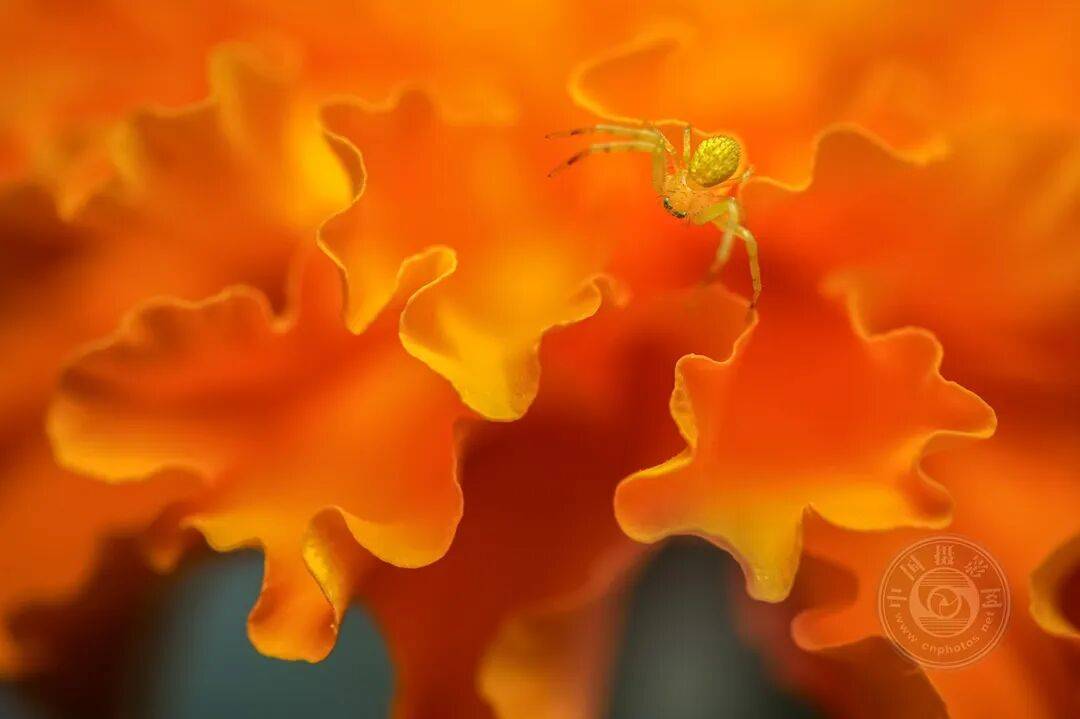 一只微小的蟹蛛栖息在非洲万寿菊花瓣的弧度上,仿佛漂浮在起伏的海洋波涛中,静待当日的猎物。玛尔塔使用60毫米超微距镜头配合大光圈,既突显了特定细节,又在层叠的花瓣间营造出柔和的虚化效果。