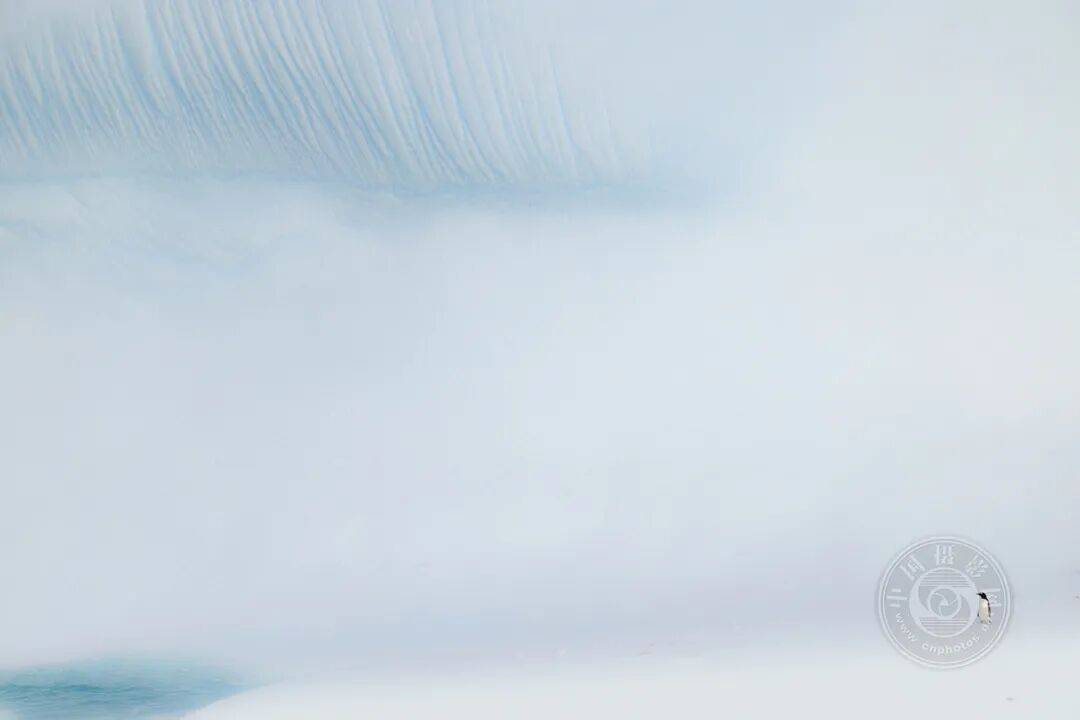 在南极洲,巴布亚企鹅有时会利用大型冰山休息,然后再返回水中。这张照片采用极简主义构图手法,突出了企鹅与环境的融合。