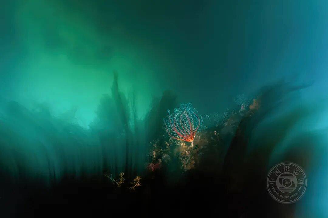 一只羽星(海百合)附着在码头浮桥的底部。桑德拉采用长曝光拍摄,使背景呈现朦胧感,营造出如风景画般的意境。同时,她运用带聚光罩的闪光灯定格了羽星的动态。桑德拉的创作意图是打造一张令观者产生模糊感的作品。