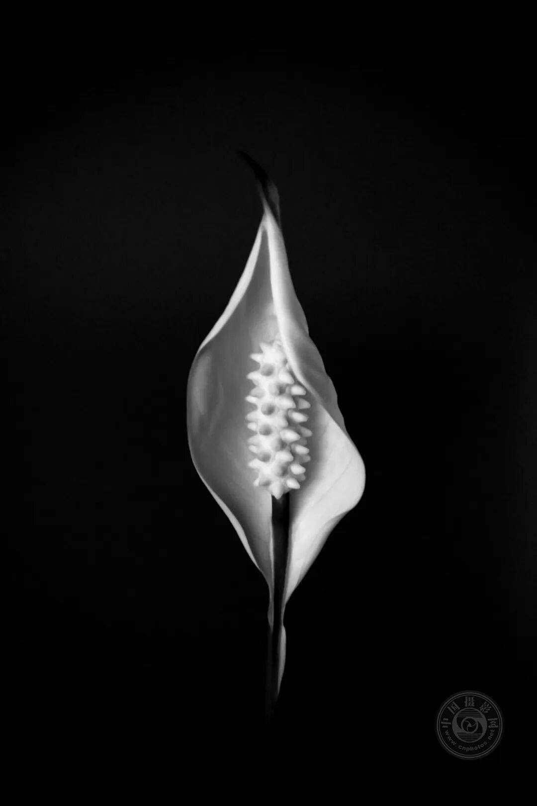 这幅单色图像突显了和平百合白色花朵与深色茎秆之间的对比。黑白摄影手法使花朵的形态从周围的黑暗中清晰显现。