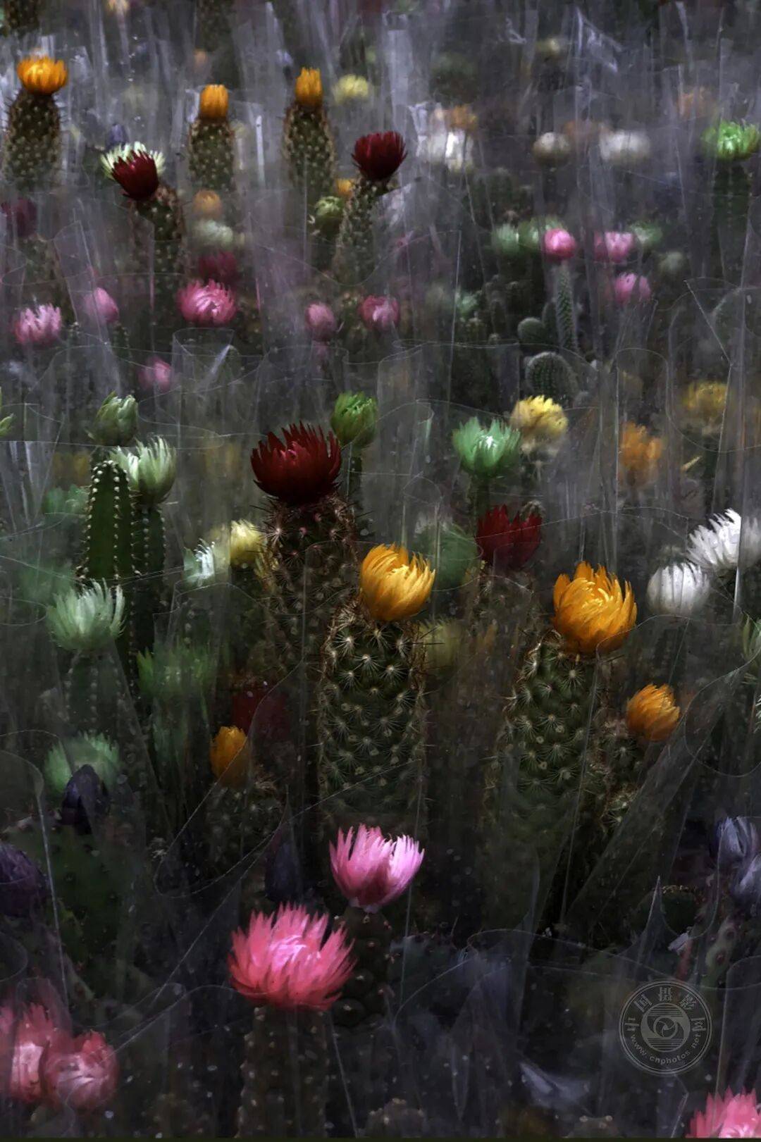 2018年7月1日,帕特里克捕捉到这些仙人掌花绽放的瞬间——它们在尖刺丛中探出头来,绽放出各种精致的色调。这些仙人掌陈列于加利福尼亚州卡皮托拉市的一家苗圃中,每株都裹着薄薄的玻璃纸套。
