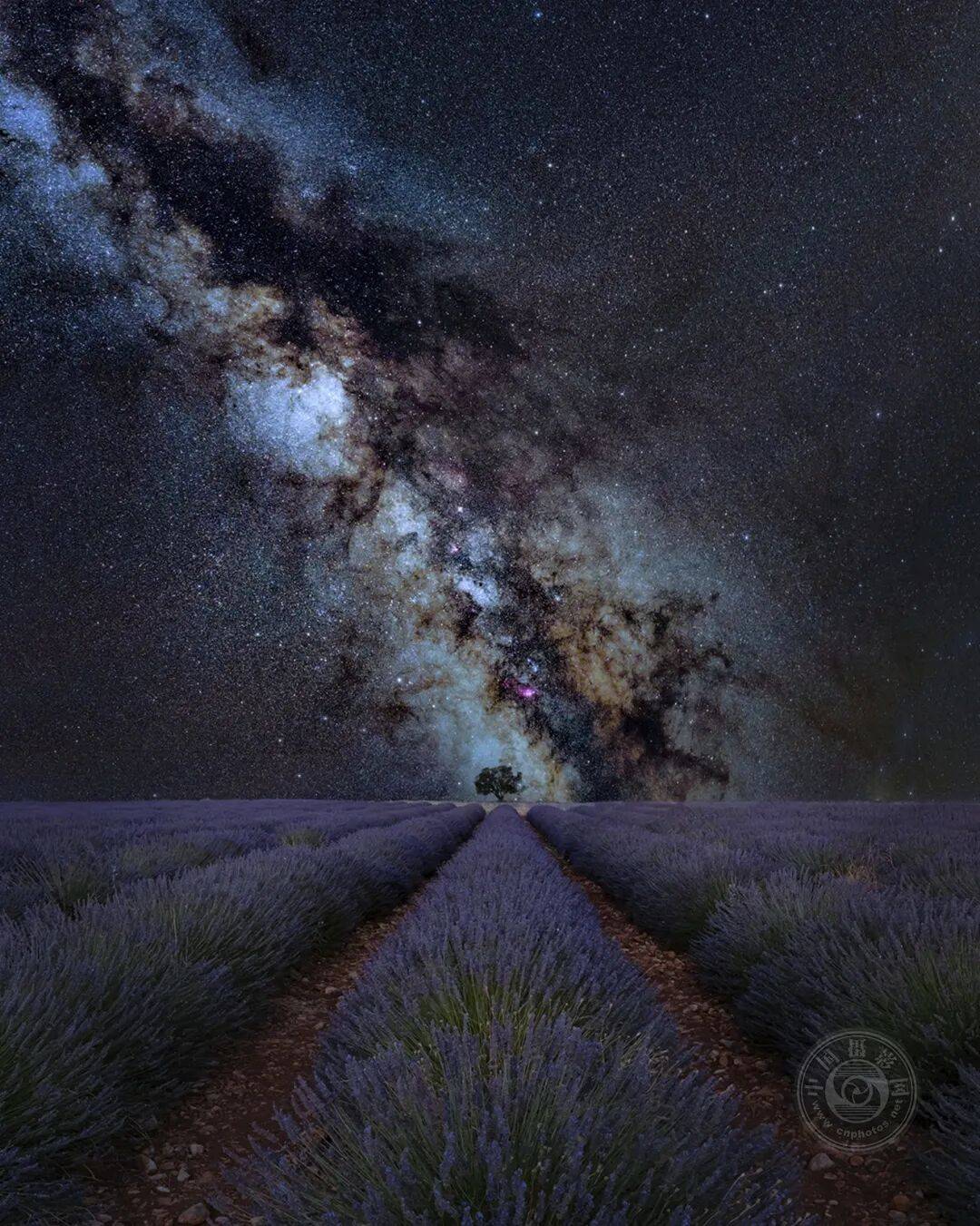 这张照片捕捉了银河与孤树交汇的瞬间。前景的薰衣草田形成优美的引导线,将观者的视线引向交汇点。前景部分拍摄于蓝调时段,而天空部分则在深夜从相同位置、使用相同焦距拍摄而成。