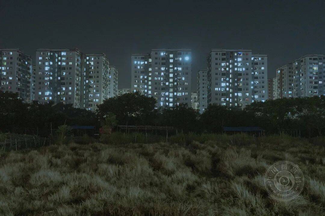 高楼林立的人造天际线在远处延伸,而前景中未开发的荒野却绵延不绝,宛如往昔的残影。每扇亮起的窗户都代表着一个家庭,构成垂直的社区形态,与曾经遍布田野河道的开放式水平聚居截然不同。