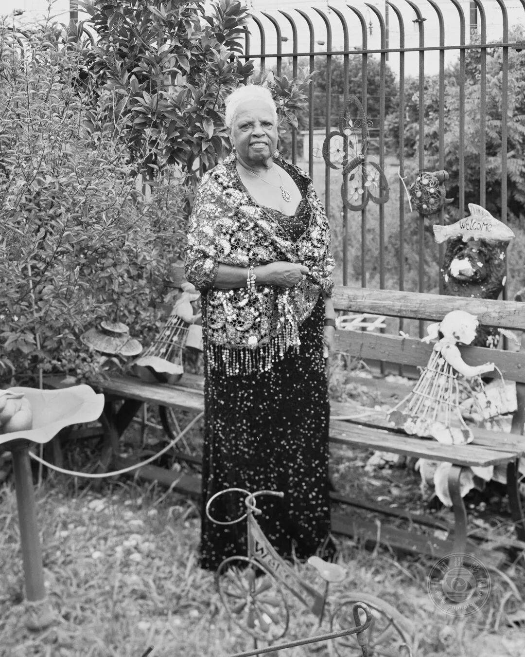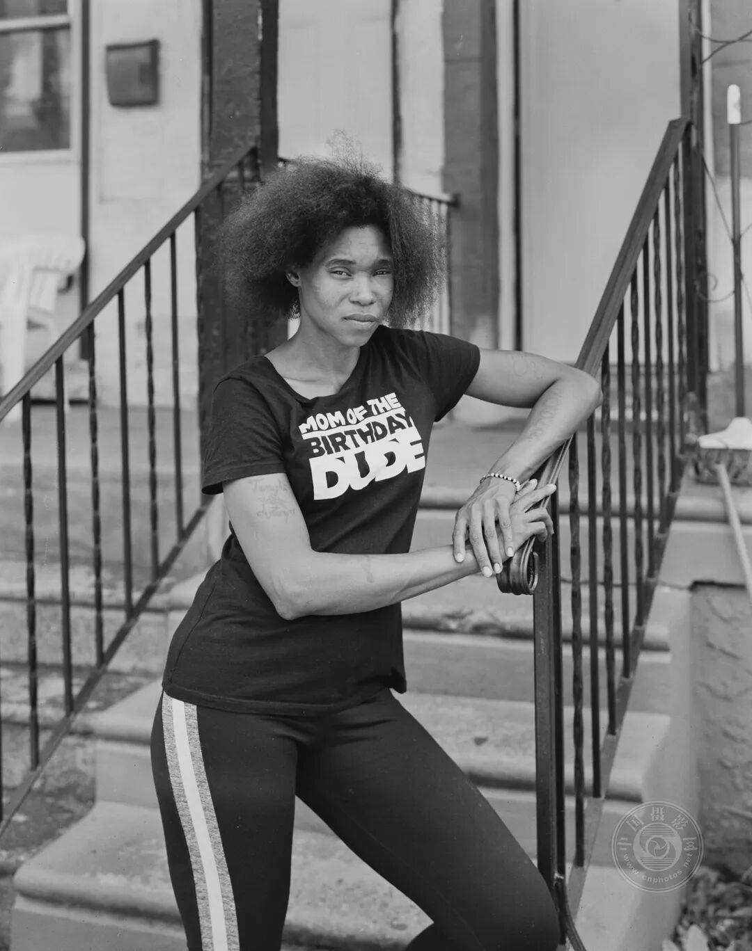 摄影师在母亲家门前遇见这位母亲,拍了几张不同角度的照片后,他请她站在屋前摆姿势。他让她倚靠在楼梯的金属栏杆上,目光看向镜头。她的姿势形成了一种流畅的造型,宛如楼梯的延伸。