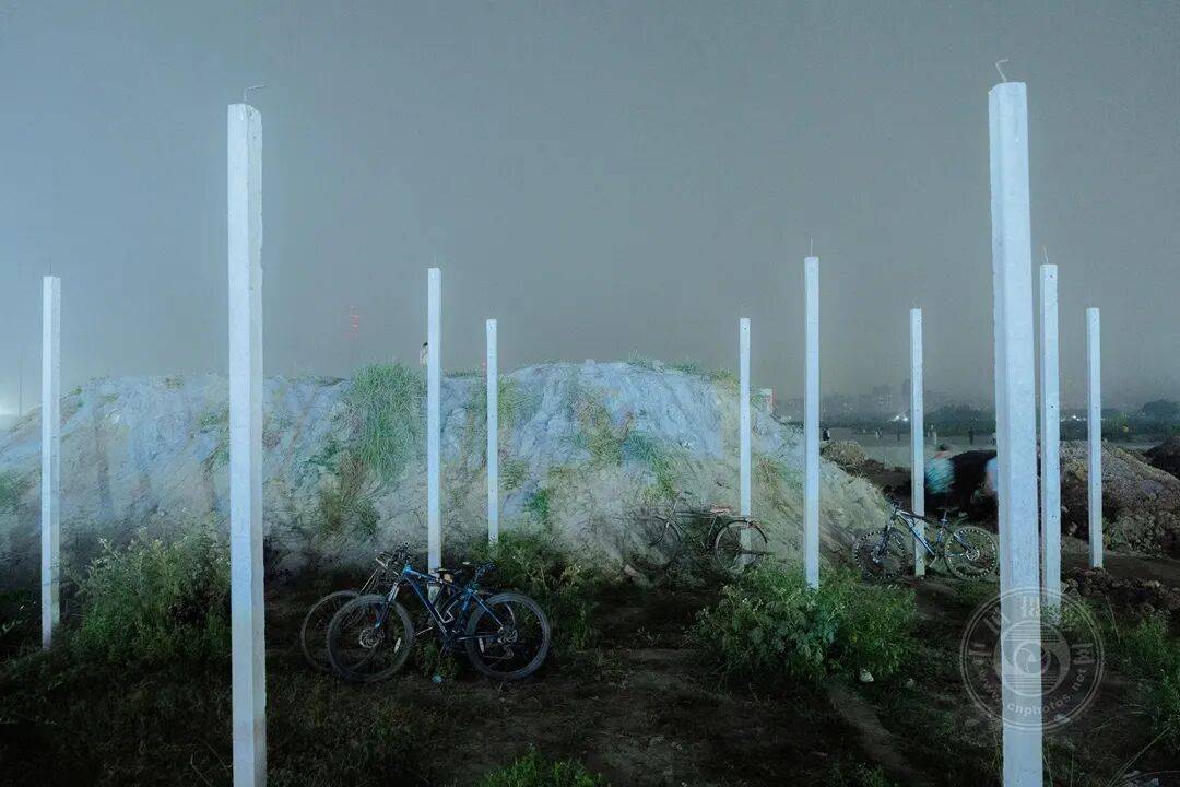 混凝土柱如骨架般耸立在朦胧夜空下,占据着曾经开阔的土地;自行车倚靠在柱基旁,紧握着转瞬即逝的自由。这片场景处于过渡地带:不再是自然,尚未成为城市。对于曾经在此嬉戏的人们,这些柱子预示着一个由利润塑造的未来。