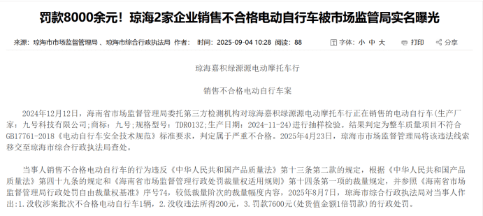 九号公司海南多次抽检不合格,多款车型因3C认证停产九号公司虽凭借智能化实现高增长,但产品合规性问题同样突出,2025年至2026年初,在海南省及海口市的多次专项抽检中,九号电动自行车多次被检出不符合新国标要求,成为海南市场监管部门的重点整改对象。