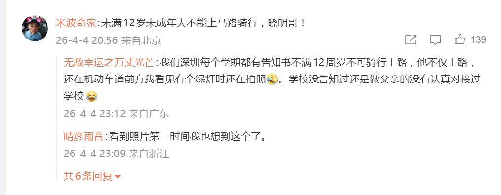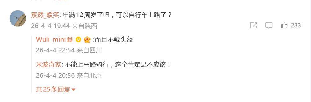 然而,温馨画风很快被另一波“较真”的网友提醒打破。有网友明确指出,根据中国《道路交通安全法》的相关规定,驾驶自行车、三轮车必须年满12周岁。黄晓明带着年仅9岁的小海绵在道路上骑行,这一行为本身涉嫌违规。此外,还有网友对照片中两人均未佩戴安全头盔,以及在非静止的交通环境(马路/人行道前)停留拍照的行为表示担忧,认为这可能给孩子带来安全隐患。