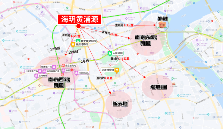 海玥黄浦源:直线南京西路“恒梅泰”只有约1.5公里!自行车即可达!约2.5公里内涵盖南京东路、人广来福士、外滩、新天地、淮海路、老城厢等顶级商圈和地标!