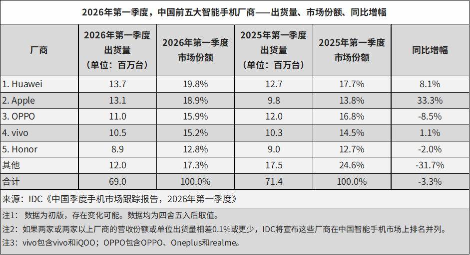 IDC 4 月 15 日最新发布的《中国季度踪报告》初步统计数据显示,2026 年第一季度,中国智能手机市场出货量约为 6,901 万台,同比下降 3.3%,整体表现略高于预期,主要得益于华为与苹果的强势拉动。