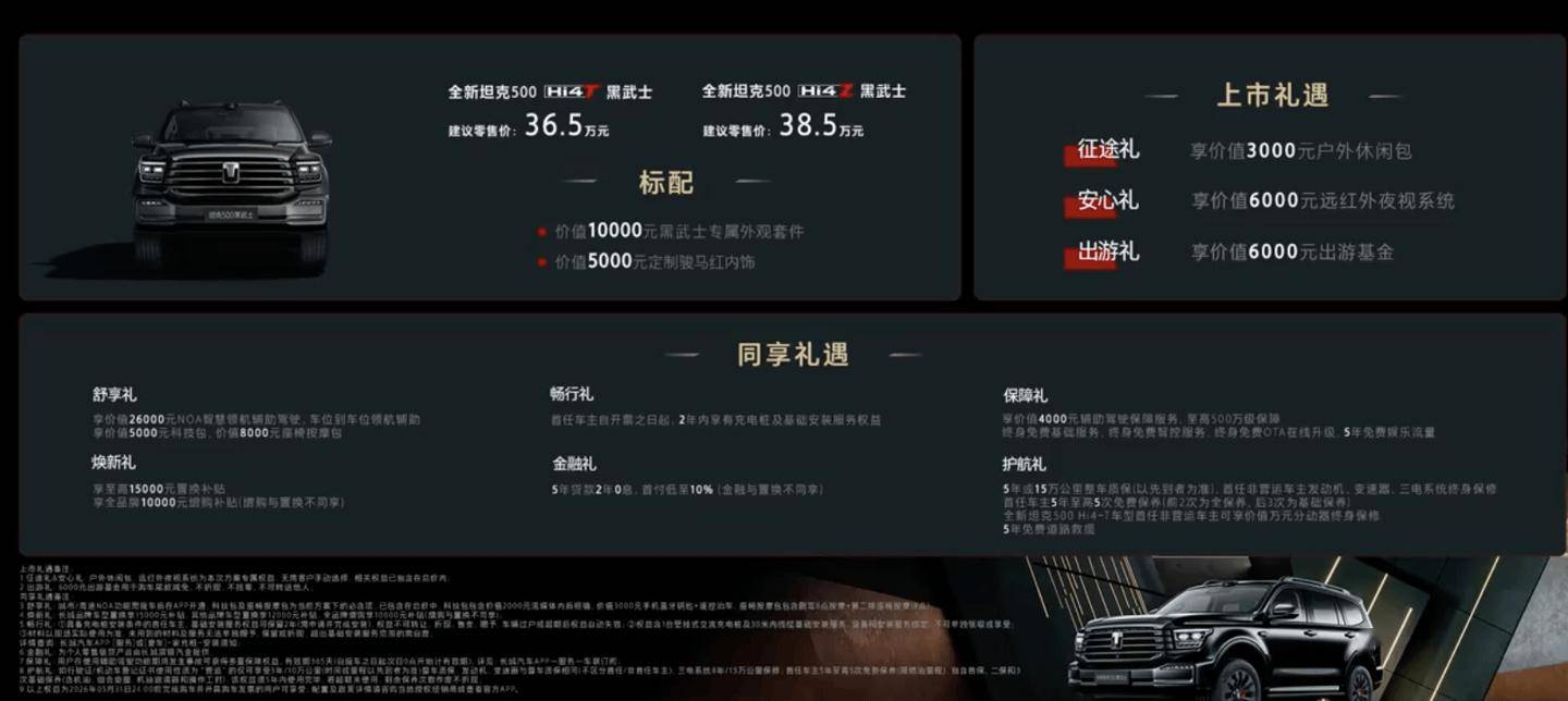 全新坦克 500 黑武士正式上市,首批限量 500 台。新车采用原厂一体化全黑套件,内饰红黑撞色,并提供 Hi4-T 与 Hi4-Z 两种动力版本,分别主打强悍越野与泛越野属性。售价 36.5 万元起,你心动了吗?