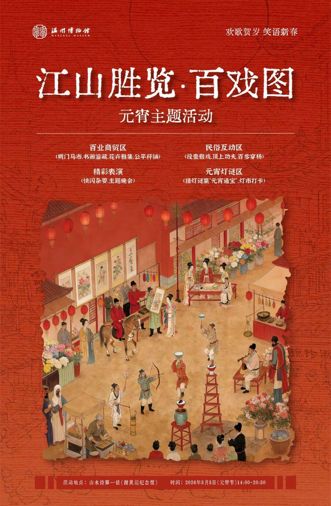 3月3日,山水诗第一楼(谢灵运纪念馆)将开展“江山胜览・百戏图”元宵主题活动,看杂耍、逛市集、猜灯谜、集章兑礼,市民可亲身体验八百年前温州港的热闹与雅致,做一日画中客,共度别样元宵。
