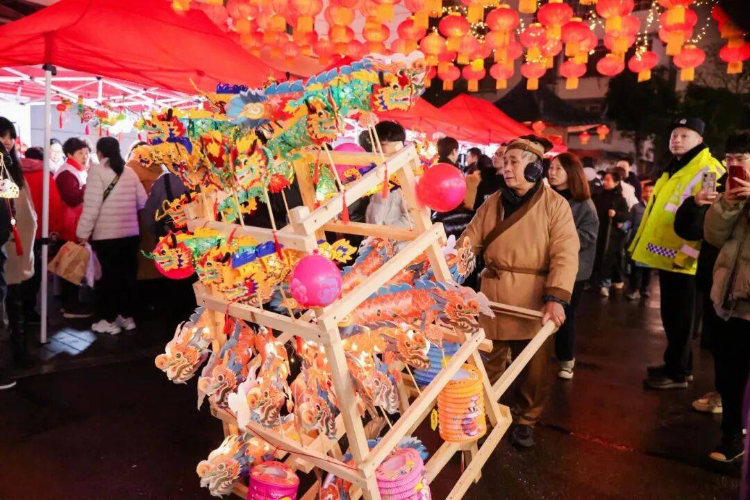 3月3日,荻港古村化身元宵乐园。“水上市集”:非遗手作、丝绸文创、传统小吃一应俱全;“千灯迷局”:马年生肖灯、鱼形灯、蚕茧灯高悬,红纸谜笺藏着趣味与底蕴;“福市寻年”非遗糖画、手作糖葫芦、传统爆米花轮番登场,串联起童年的甜蜜与烟火气。